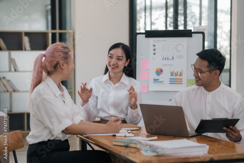© amnaj, Fototapeta premium Three people are sitting around a table with a white board behind them. They are smiling and talking to each other