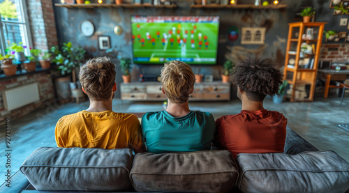 © Анна Терелюк, Naklejka premium Three people are sitting on a couch in front of a television. They are watching a soccer game