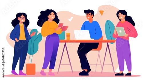 © starush, Naklejka premium Three people are standing around a table with laptops, AI