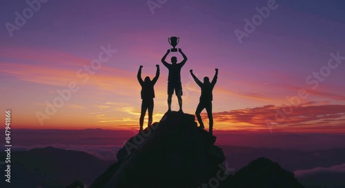 © SHOTPRIME STUDIO, Fototapeta premium Three people celebrating victory on mountain top with trophy under colorful sunset sky