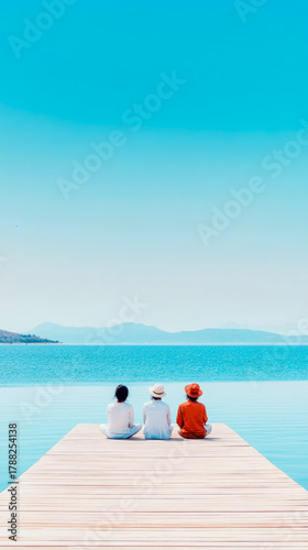 © sommersby, Fototapeta premium Three people from behind, sitting on wooden dock over serene blue waters, looking at distant horizon and mountains under clear sky