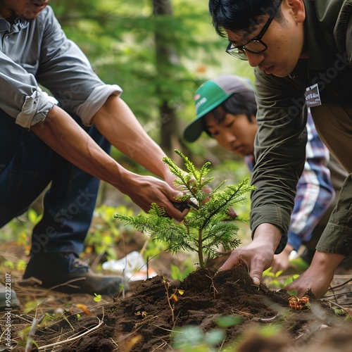 © Beer AI, Fototapeta premium Three People Planting a Sapling in a Forest