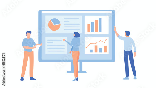 © Faran Arts, Obraz premium Three people presenting data on a screen with pie chart and bar graph and line graph and text on the screen