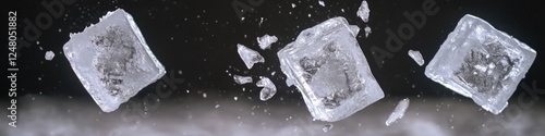 © Alla, Obraz premium Three pieces of ice falling from a dark surface, a moment frozen in time