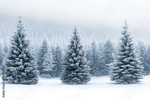 © vefimov, Naklejka premium Three pine trees are standing in a snow-covered field. The trees are bare and covered in snow, giving the scene a peaceful and serene atmosphere