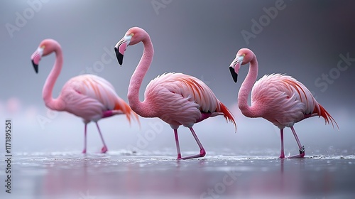 © PPS, Obraz premium Three pink flamingos wading in shallow water, misty background. (1)