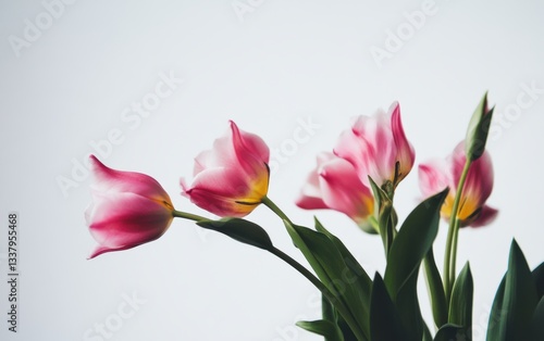 © Diffin, Fototapeta premium Three pink flowers bloom beautifully in a vase placed on a table, celebrating spring's arrival.
