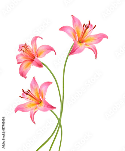 Fototapeta premium Three pink lily flowers. Isolated on white background