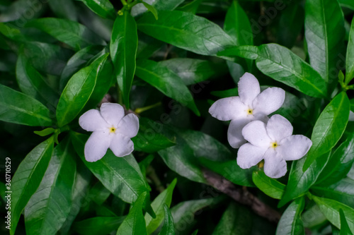 © Suman, Obraz premium Three pinwheel flowers with their green leaves after a shower