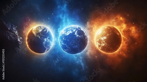 Obraz premium Three planets orbiting the Earth dark blue background