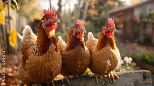 © Pinklife, Fototapeta premium Three playful and curious chickens sit together, showcasing their plumage in a sunny garden. Their presence embodies the charm of farm life and natural beauty.