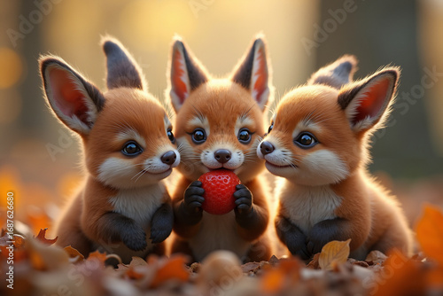 © Светлана Кудашкина, Obraz premium Three playful fox cubs sharing a red ball in autumn leaves