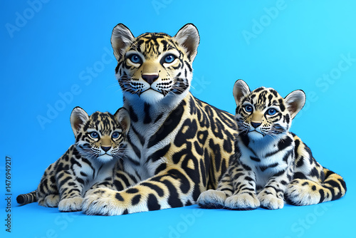 © Mariani, Naklejka premium Three playful leopards resting together on a vibrant blue background, showcasing their unique patterns
