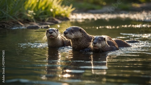 Fototapeta premium Three playful otters swimming in a serene river, surrounded by lush greenery and soft sunlight