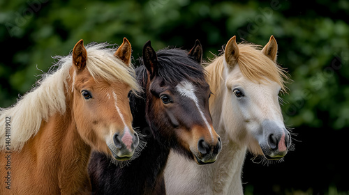 © Sujito, Fototapeta premium Three Ponies Close-up Portrait Against Green Forest Background