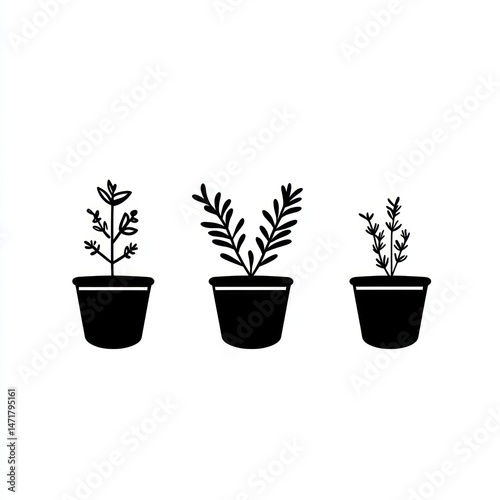 © Teruss, Obraz premium Three potted herbs, kitchen garden, minimalist design, cooking recipe illustration