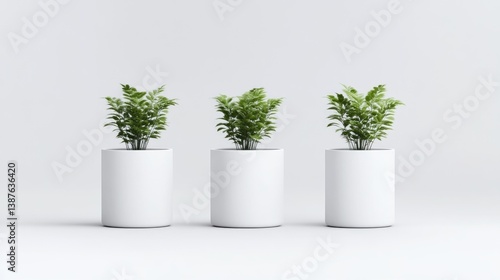 © Giman, Obraz premium Three potted plants in white cylindrical containers against a plain white background. A minimalist, modern, and clean design