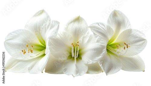 © Ilhamrusdy, Obraz premium Three pristine white flowers, petals open, central focus, black backdrop