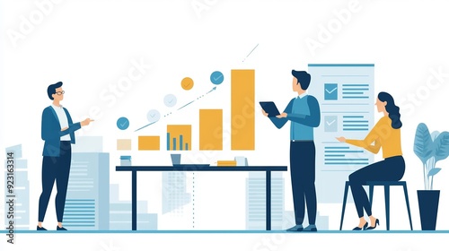 © Pual GotoMars, Obraz premium Three professionals discussing growth trends in an office. Charts and data illustrate positive business progress.
