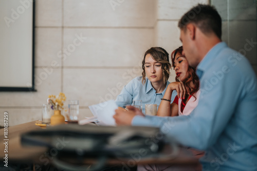 © qunica.com, Obraz premium Three professionals review papers and discuss ideas around a table in a focused, collaborative office setting.