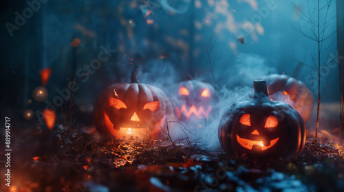 Fototapeta premium Three pumpkins with glowing eyes and a spooky atmosphere