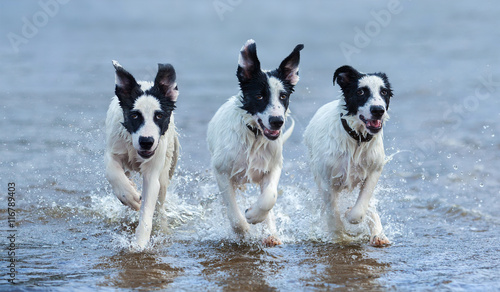 © Kseniya Abramova, Obraz premium Three puppies of mongrel running on water.