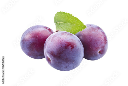 © GodNopparat, Obraz premium Three purple plums with green leaves on top. on transparent background.