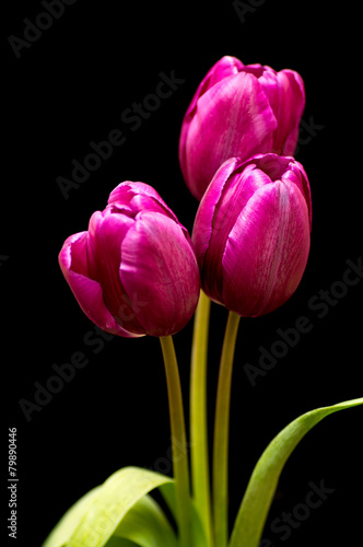 © shogun133, Fototapeta premium Three purple tulip on black background with green leafs