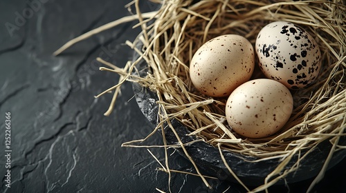 © Ariep, Fototapeta premium Three Quail Eggs in a Nest