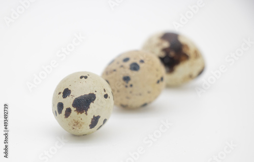 Fototapeta premium Three quail eggs isolated on white background, organic food ingredients Can...