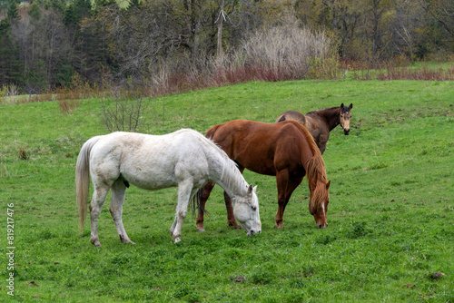 © Richard Nantais, Fototapeta premium Three quarter horses in a Quebec field