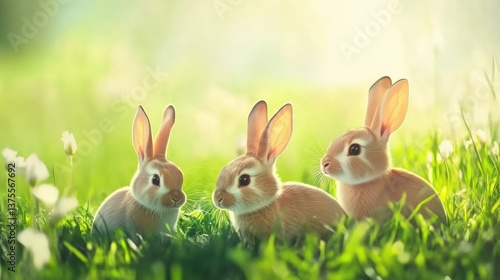 © Alexander, Obraz premium Three rabbits are sitting in a grassy field. Easter