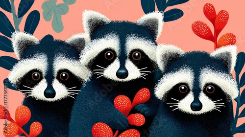 Obraz premium Three raccoons are sitting in a tree with red leaves. Scene is playful and...