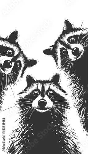 © Oleksandr Pokusai, Fototapeta premium three raccoons peering downward with wide-eyed expressions, ideal for humor or wildlife themes sketch engraving generative ai vector illustration. Scratch board imitation. Black and white image.