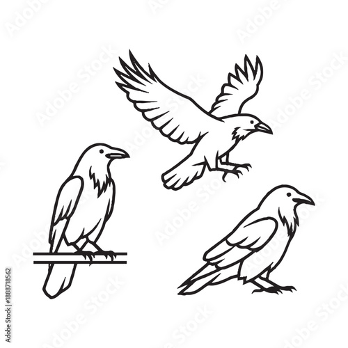 © MdZulhash, Obraz premium Three ravens in different poses flying and perched black outline on white background animal