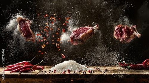 © harryaishi, Obraz premium Three raw lamb chops levitating with spices.