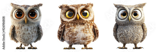© AghnaMedia, Naklejka premium Three realistic owl figurines with different feather patterns isolated on transparent background