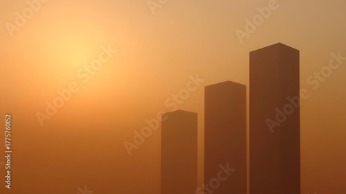 © A2Z AI , Fototapeta premium Three rectangular pillars are silhouetted against a warm, orange-toned sky at dawn or dusk. The atmosphere is thick with haze, creating a soft, dreamy feel. The sky is vibrant.