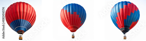 Fototapeta premium Three red and blue hot air balloons are floating against a white background.