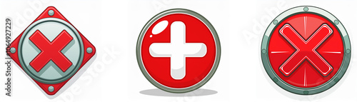 © YiuCheung, Obraz premium Three red buttons with white symbols: a cross, a plus sign, and an 'X'.