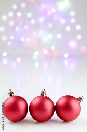 Fototapeta premium Three red christmas balls and some colorful lights against white background....