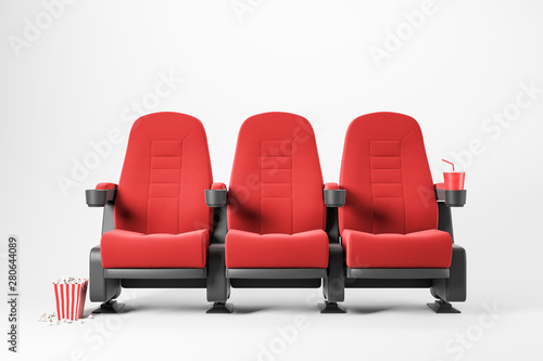 © ImageFlow, Obraz premium Three red cinema chairs on white background