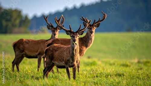 © Doni, Fototapeta premium Three red deer in a grassy field at dawn