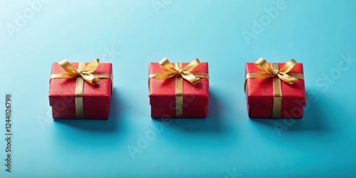 Fototapeta premium Three Red Gift Boxes with Gold Ribbon on Blue Background
