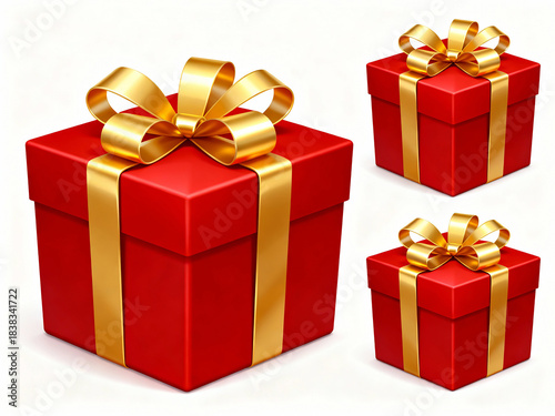 Fototapeta premium Three red gift boxes with gold ribbons and bows