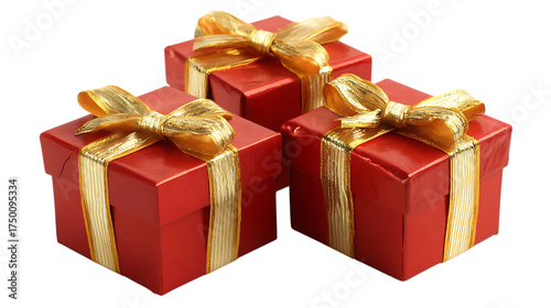 © Asad, Fototapeta premium Three red gift boxes with golden ribbon isolated on transparent background