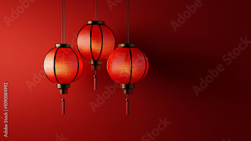 © Art.disini, Obraz premium Three red lanterns hang from a red wall.