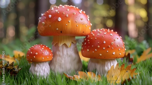 © ardanz, Obraz premium Three Red Mushrooms in a Forest