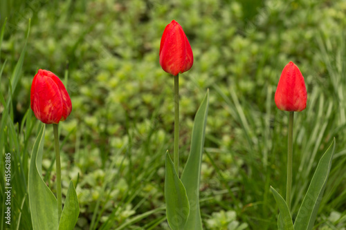 Fototapeta premium Three red tulip buds in garden. Floral background