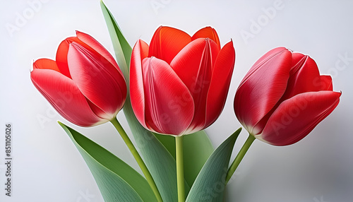 Naklejka premium Three Red Tulips In Bloom Against A White Background